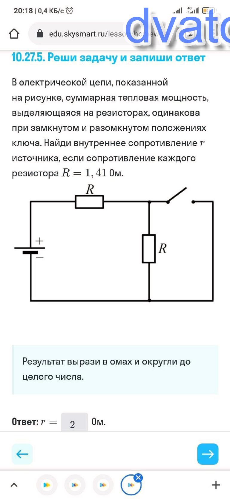 В электрической цепи, показанной на рисунке, суммарная тепловая мощность, выделяющая на резисторах, одинакова при замкнутом и разомкнутом положениях ключа. Найдите внутреннее сопротивление r источника, если сопротивление каждого резистора R=1, 41 Ом.