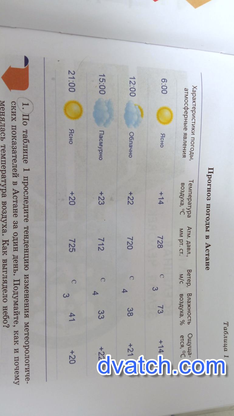 По таблице номер один проследите тенденцию изменения метеорологических показателей в Астане за один день. Подумайте как и почему менялась температура воздуха. Как выглядело небо ?