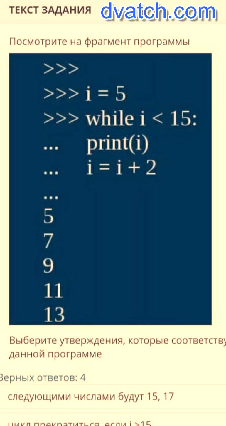 цикл прекратиться, как только i будет больше или равно 15, короче последняя итерации будет 13, дальше ничего выводиться не будет.
