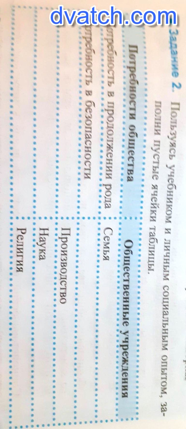 Глава 1. Мы живём в обществе пар. 1 Как устроена общественная жизнь задание 2пользуясь учебником и личными социальным опытом , заполни пустые ячейки таблицы. ( фото сделано )задание 3 выбери правильный ответКакие из перечисленных терминов используются в первую очередь при описании хозяйственной жизни общества 1) религия , мораль 2) производство, обмен 3) государства, власть 4) нация, племя. задание 5 выбери правильный ответ Учёные-обществоведы определяют общество как 1) группу людей , находящихся на определенной территории 2) обособившуюся от природы часть мира , связанную с деятельностью людей 3) совокупность природных и социальных явлений 4) всё созданное человеком задание 8 приведи примеры общественных отношений сотрудничества и соперничества. ответьте за 20. 09. 21
