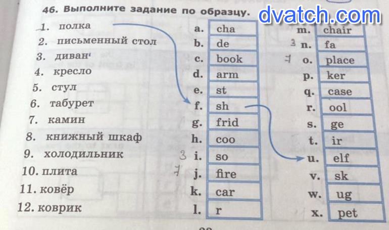 m. chair3n. fa1 o. placeр. kerq. caseг. ool46. Выполните задание по образцу. 1. полкаа. cha2. письменный стол b. de3. диванс. book4. креслоd. arm5. стуле. st6. табуретf. I sh7. камин8. книжный шкафh. соо9. холодильникЗі. SO10. плита7 . j. fire11. ковёрk. car12. коврикr23g. fridS. t. geirelfskи. V. w. ugх. pet1.