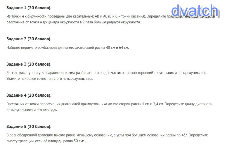 Итоговый тест за четверть МОЛЮ посчитайте Задание 1 (20 поинтов). Из точки A к окружности проведены две касательные: AB и AC (B и С – точки касания). Определите градусную меру дуги BC, если расстояние от точки A до центра окружности в 2 раза больше радиуса окружности. Задание 2 (20 поинтов). Найдите периметр ромба, если длины его диагоналей равны 48 см и 64 см. Задание 3 (20 поинтов). Биссектриса тупого угла параллелограмма разбивает его на две части: на равносторонний треугольник и четырехугольник. Укажите наиболее точно тип этого четырехугольника. Задание 4 (20 поинтов). Расстояния от точки пересечения диагоналей прямоугольника до его сторон равны 1 см и 2,4 см. Определите длину диагонали прямоугольника и его площадь. Задание 5 (20 поинтов). В равнобедренной трапеции высота равна меньшему основанию, а углы при большем основании равны по 45°. Определите высоту трапеции, если её площадь равна 50 см2.