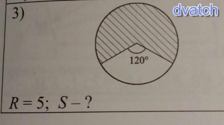 : площадь всего круга вычисляется пи эр квадрат : 3,14 * 5 * 5 = 78,5 Так как в круге 360 градусов , а у нас 360/120 =3 третья часть круга получаем : Площадь заштрихованной фигуры 78,5 / 3 = 26,17