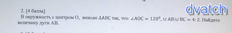 2. [4 балла]В окружность с центром 0, вписан АВС так, что AOC = 120, U АВ:U BC = 4:2. Найдитевеличину дуги АВ.