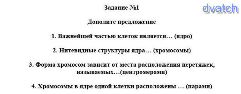 Дополните предложение1. Важнейшей частью клеток является (ядро)2. Нитевидные структуры ядра (хромосомы)3. Форма хромосом зависит от места расположения перетяжек, называемы (центромерами)4. Хромосомы в ядре одной клетки расположены (парами)