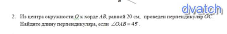 Перпендикуляр делит хорду пополам, по свойству перпендикуляра к хорде, значит, половина хорды =10 см. А т. к. ΔАОВ- равнобедренный, в нем ОА=ОВ- как радиусы одной окружности, то треугольник, составленный половиной хорды, перпендикуляром и радиусом, тоже равнобедренный, т. к. один угол ОАВ=45°, треугольник прямоугольный, значит, в нем другой острый угол тоже 45° Значит, длина перпендикуляра равна половине хорды. 10 см.