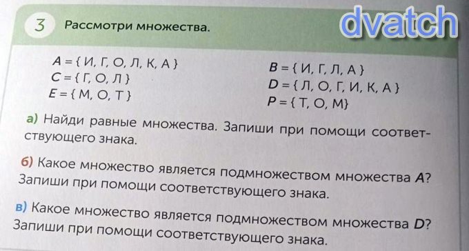 3 Рассмотри множества. А={И, Г, О, Л, К, А } С= {Г, О, Л} E = {M, O, T} В = {И, Г, Д, А} D = { Л, О, Г, И, К, А } Р= {T, O, M} а) Найди равные множества. Запиши при помощи соответ ствующего знака. б) Какое множество является подмножеством множества А? Запиши при помощи соответствующего знака. в) Какое множество является подмножеством множества D? Запиши при помощи соответствующего знака. НУЖНО СДЕЛАТЬ А) И В)