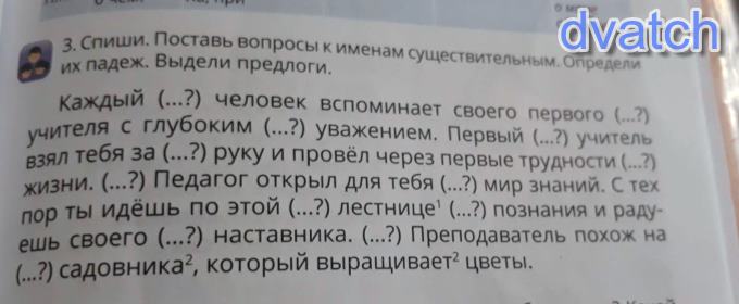 Каждый (кто?, И. п. ) человек вспоминает своего первого (кого?, В. п. ) учителя с глубоким (чем?, Тв. п. ) уважением. Первый (Кто?, И. п. ) учитель взял тебя за (что?, В. п. ) руку и провёл через первые трудности (что?, В. п. ) жизни. (кто?, И. п. ) Педагог открыл для тебя (кого?, Р. п. ) мир знаний. С тех пор ты идёшь по этой (чему?, Д. п. ) лестнице (чего?, Р. п. ) познания и радуешь своего (кого?, В. п. ) наставника. (Кто?, И. п) Преподаватель похож на (кого?, В. п. ) садовника, который выращивает (что?, В. п. ) цветы.