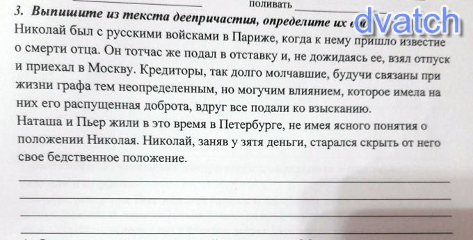 3. Выпишите из текста деепричастия, определите их вид Николай был с русскими войсками в Париже, когда к нему пришло известие о смерти отца. Он тотчас же подал в отставку и, не дожидаясь ее, взял отпуск и приехал в Москву. Кредиторы, так долго молчавшие, будучи связаны при жизни графа тем неопределенным, но могучим влиянием, которое имела на них его распущенная доброта, вдруг все подали ко взысканию. Наташа и Пьер жили в это время в Петербурге, не имея ясного понятия о положении Николая. Николай, заняв у зятя деньги, старался скрыть от него свое бедственное положение.