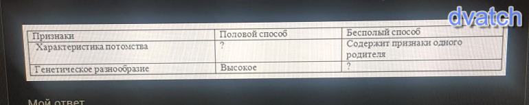 Характеристика потомства половой способ - Содержит признаки двух родителей; Генетическое разнообразие бесполый способ - низкое
