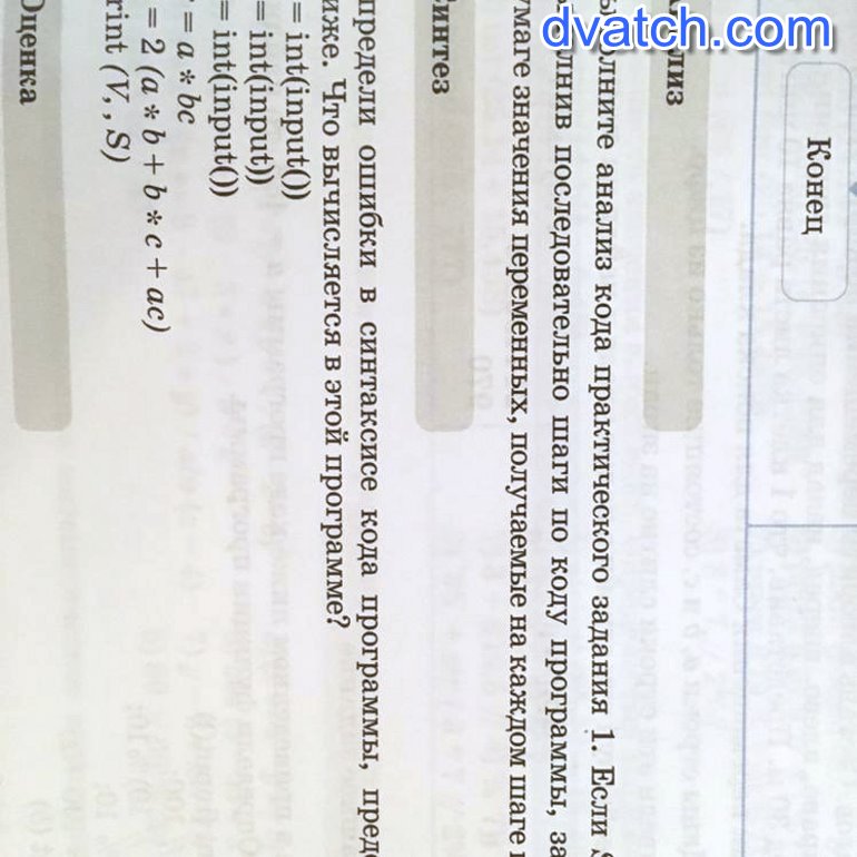 DO-АнализВыполните анализ кода практического задания 1. Если S = 789, то,выполнив последовательно шаги по коду программы, запишите набумаге значения переменных, получаемые на каждом шаге программы. Синтез-, 50етсябли-Определи ошибки в синтаксисе кода программы, представленнойниже. Что вычисляется в этой программе?a = int(input()b = int(input))c = int(input())U: = a + bcS = 2 (a+b+b + c + ac)print (V, , S)шт. посчитайтеДам 30 поинтов