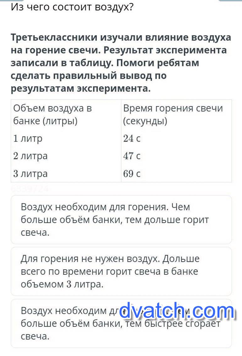 Из чего состоит воздух?Третьеклассники изучали влияние воздуха на горение свечи. Результат эксперимента записали в таблицу. Помоги ребятам сделать правильный вывод по результатам эксперимента. Объем воздуха в банке (литры)1 литр2 литра3 литраВремя горения свечи (секунды)24 с47 с69 с6839724Воздух необходим для горения. Чем больше объём банки, тем дольше горит свеча. Воздух необходим для горения. Чем больше объём банки, тем быстрее сгорает свеча. Для горения не нужен воздух. Дольше всего по времени горит свеча в банке объемом 3 литра.