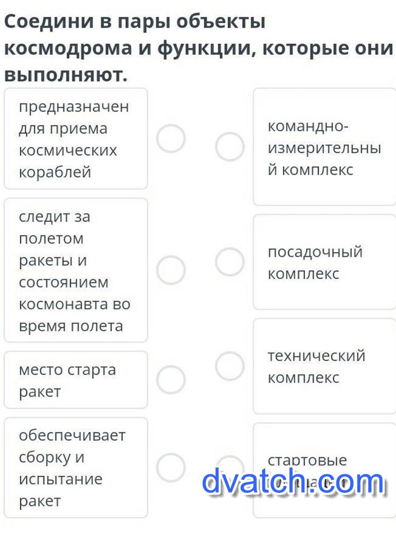 Соедини в пары объекты космодрома и функции, которые они выполняют. предназначен для приема космических кораблей следит за полетом ракеты и состоянием космонавта во время полета место старта ракет обеспечивает сборку и испытание ракет О командно измерительны й комплекс посадочный комплекс технический комплекс O стартовые площад