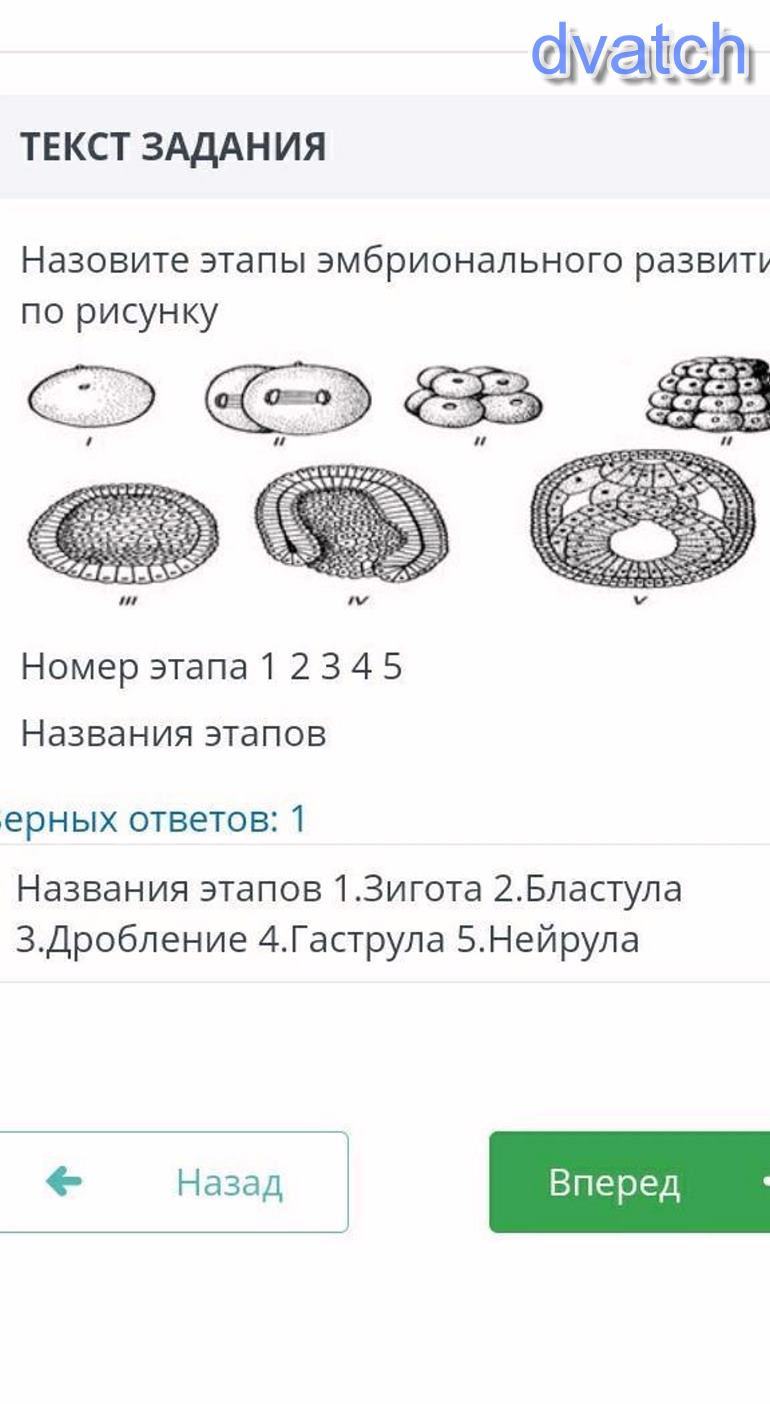 1. Зигота; 2. Дробление; 3. Бластула; 4. Гаструла; 5. Нейрула
