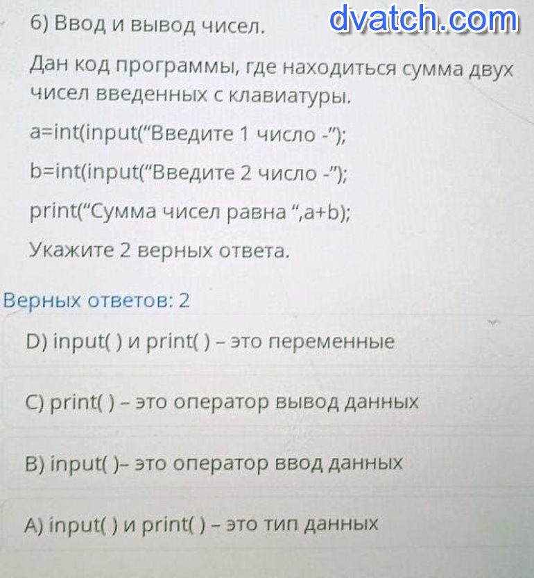 6) Ввод и вывод чисел. Дан код программы, где находиться сумма двухчисел введенных с клавиатуры,a=int(input(“Введите 1 число - 9);b=int(input("Введите 2 число -");print("Сумма чисел равна “, a+b);Укажите 2 верных ответа. Берных ответов: 2D) input( ) и print( ) - это переменныеC) print( ) - это оператор вывод данныхB) input( )- это оператор ввод данныхA) input() и print() - это тип данных