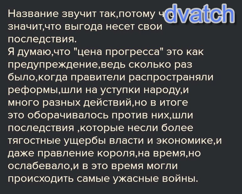 Ну цена прогресса это предупреждение, потому что сколько раз было, когда главы государств и цари несли реформы в масы. Уступали народу, и делали многое другое,но потом имже было хуже для них самих,которые несли за собой проблемы власти и экономике, и даже у королей падала устойчивость и из за этого были страшные войны