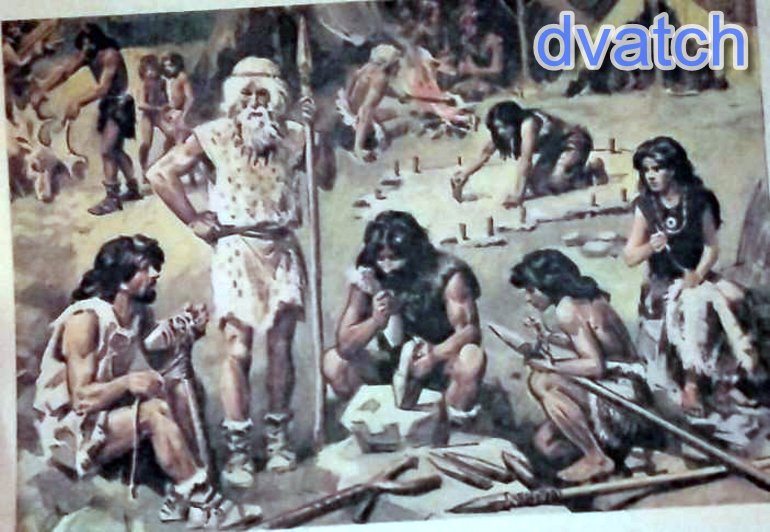 На рисунке изображена родовая община древних людей. На переднем плане мужчины занимаются изготовлением орудий труда и охоты, а женщина шьет одежду из шкур. На заднем плане мы видим женщину, которая разрезает растянутую на кольях и высушенную шкуру, людей, которые готовят пищу на костре, мужчину, который принес череп оленя для дальнейшей его обработки. Дети сидят в палатке и наблюдают за работой взрослых, перенимая опыт