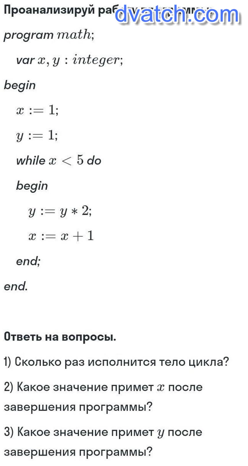 4) Как узнать сколько раз исполнится тело цикла если изменить условие на x<=5?5) Как узнать сколько раз исполнится тело цикла если изменить условие на x>=5? 6)Как узнать сколько раз исполнится тело цикла если изменить условие на x>0?7) что произойдет если из тела цикла убрать команду x:=x+1?8)Как узнать сколько раз исполнится тело цикла если изменить команду x:=x+1 на x:=2+2?9) Как узнать сколько раз исполнится тело цикла если изменить команду x:=x+1 на x:=x-1?