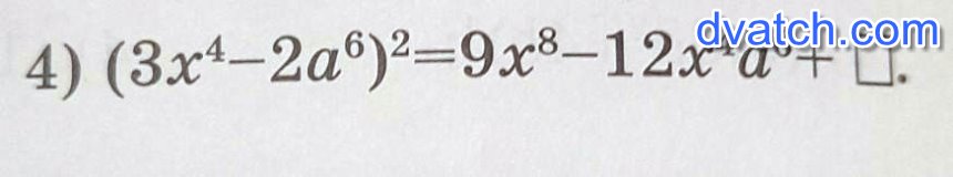 Получаем, что (3x^4-2a^6)^2=9x^8 - 12*(x^4)*a^6 + 4a^12