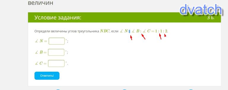 В данной задачи всего частей - 4, сумма углов 180°, найдем величину части 180/4 то одна часть 45°, углы N и B по одной части, значит равны 45°, а угол C - 2 части поэтому равен 90°
