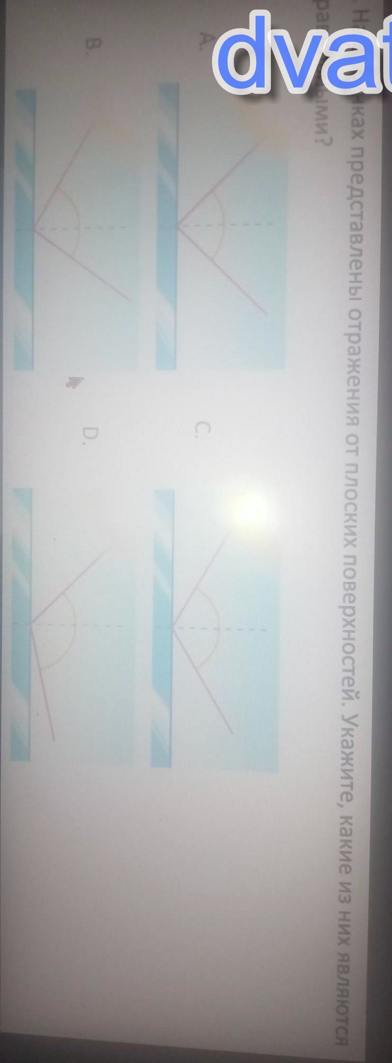 2. На рисунках представлены отражения от плоских поверхностей. Укажите, какие из них являютсяправильными?А. С. D.