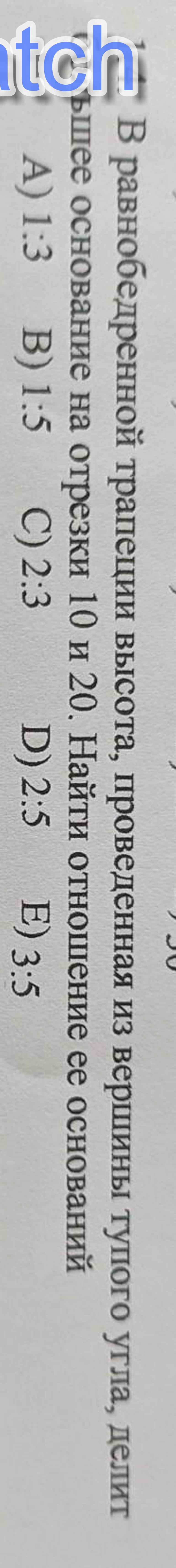 1. 4. В равнобедренной трапеции высота, проведенная из вершины тупого угла, делит большее основание на отрезки 10 и 20. Найти отношение ее оснований А) 1:3 В) 1:5 С) 2:3 D) 2:5 E) 3:5