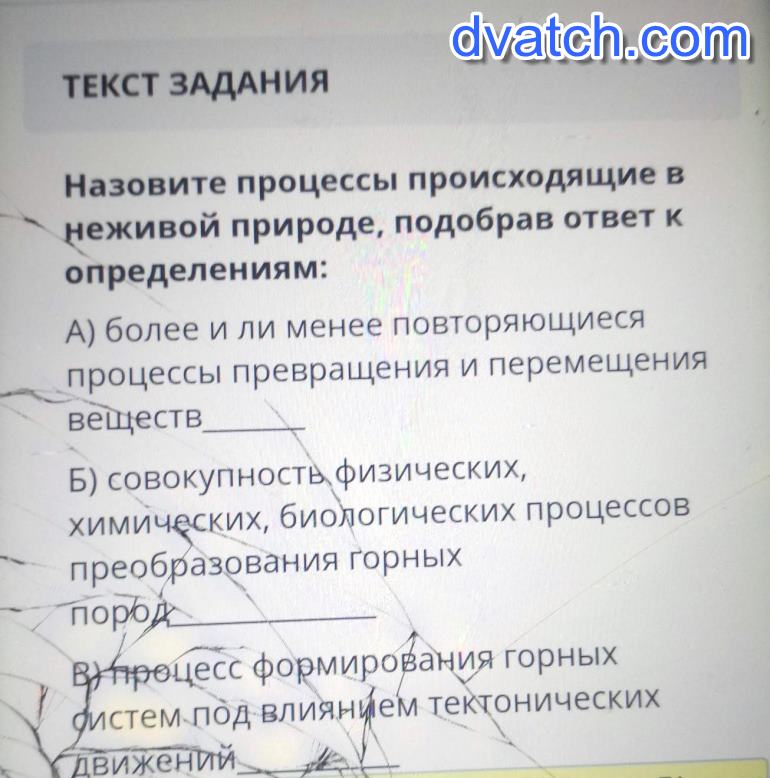 Назовите процессы происходящие внеживой природе, подобрав ответ копределениям:А) более или менее повторяющиесяпроцессы превращения и перемещениявеществБ) совокупность физических,химических, биологических процессовпреобразования горныхпроодВ) процесс формирования горныхсистем под влийтнием тектоническихСОР