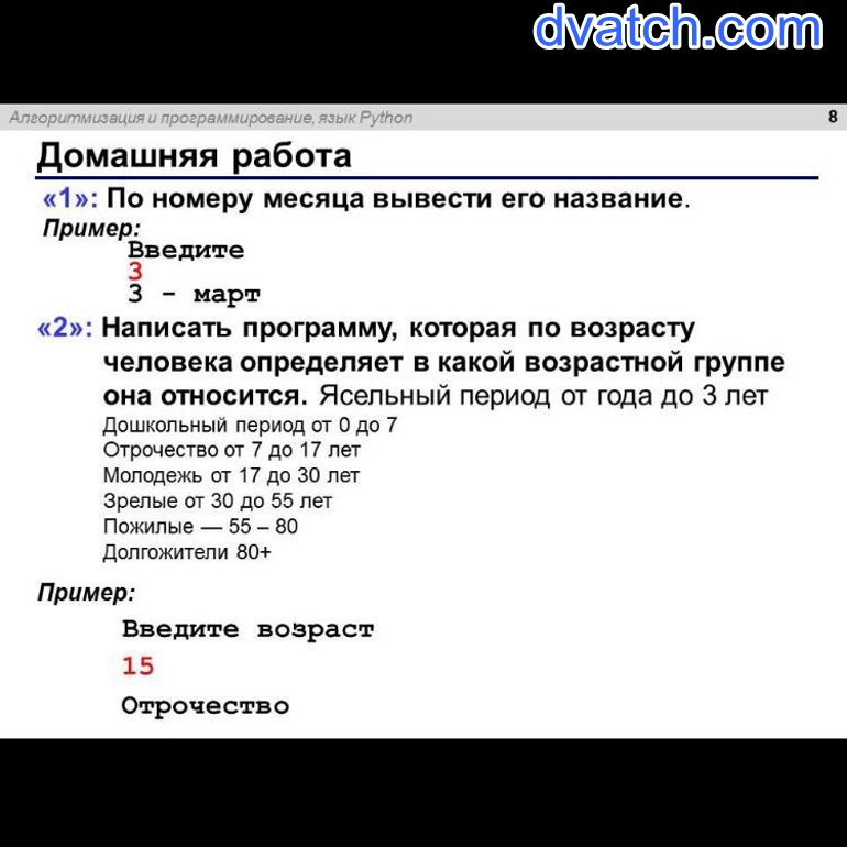 vozrast = int(input('Ваш возраст: ')) if 0>= vozrast <=7: print("Дошкольный период") elif >=7 vozrast <=17: print("Отрочество") elife >=17 vozrast <=30: print("Молодежь") elife >=30 vozrast <=55: print("Пожилые") elife >=55 vozrast <=80: print("Долгожители")