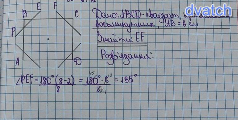 Допоможіть зробити задачу:Кути квадрата зі стороною 6 см зрізали так, що отрималиправильний восьмикутник. Знайдіть сторону утвореного восьмикутника.