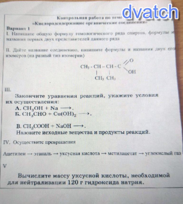 1. CnH2n+1OH CH3OH метил C2H5OH этил 2. 2. 3 диметилбутановая кислота 2 метилпентановая кислота Гептановая кислота 3. 2CH3OH+2Na=2CH3ONa+H2 Ch3CHO+2CU(OH)2=CH3COOH+2CuOH+H2O CH3COOH+NaOh= Ch3COONa+H2O 4. C2H2+H2O=CH3CHO CH3COH+Ag2O=CH3COOH+Ag2 CH3COOH+CH3OH=Ch3COOCH3+H2O 5 Дано NaOH=120 г CH3COOH-? CH3COOH +NaOH=CH3COONa+H2O n(NaOH)=120/40=3 моль n(NaOH)=n(CH3COOH)=3 моль m(CH3COOH)= 3*60=180г