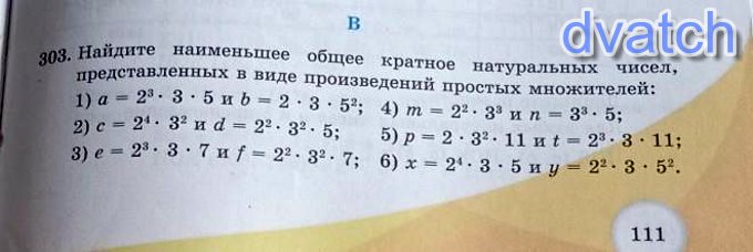 НА ФОТООО303. Найдите наименьшее общее кратное натуральных чисел,представленных в виде произведений простых множителей:1) а = 21. 3. би b = 2 • 3 - 5°; 4) m = 22 - 3° ип = 33 - 5;2) c = 24. 3° и d = 22, 32 - 5;5) p = 2 • 32. 11 и t = 23. 3. 11;3) е = 23. 3-7 и f = 22 - 32 7; 6) х = 24. 3. Биу = 22. 3. 52. фото НА ФОТОО