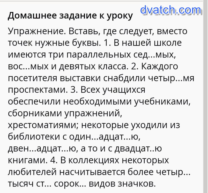 : В нашей школе имеются три параллельных седьмых, восьмых и девятых класса. 2. Каждого посетителя выставки снабдили четырьмя проспектами. 3. Всех учащихся обеспечили необходимыми учебниками, сборниками упражнений, хрестоматиями; некоторые уходили из библиотеки с одинадцатью, двенадцатью, а то и с двадцатью книгами. 4. В коллекциях некоторых любителей насчитывается более четырёх тысяч сто сорок видов значков.