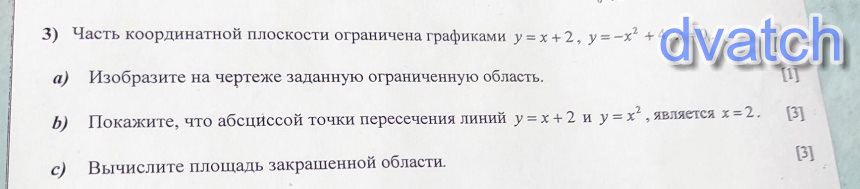 посчитайте Часть координатной плоскости ограничена графиками у=х+2,у=-х^2+4,х=0. . . . а),b),c) . . . .