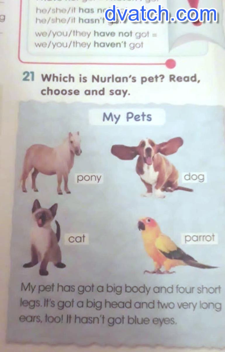 перевод у моего питомца большое тело, четыре короткие лапы, большая голова и два длинных уха. И нет голубых глаз. Больше всего под описание подходит собака