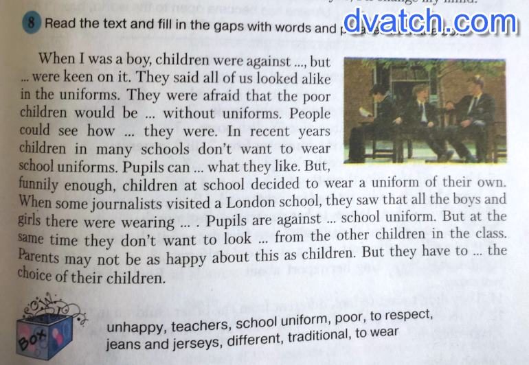1. school uniform 2. teachers 3. unhappy 4. wear 5. jeans and jerseys 6. traditional 7. different 8). espect