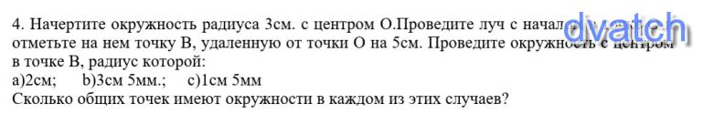 Начертите окружность радиуса 3см. с центром О. Проведите луч с началом в точке О и отметьте на нем точку В, удаленную от точки О на 5см. Проведите окружность с центром в точке В, радиус которой:а)2см; b)3см 5мм. ; c)1см 5ммКак узнать сколько общих точек имеют окружности в каждом из этих случаев?