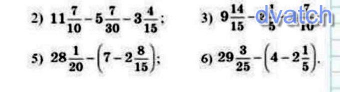 5) 28 1/20-(7-2 8/15) =28 1/20-(6 30/30-2 16/30) =28 1/20-4 14/30=27 33/60-2 28/60=25 1/12