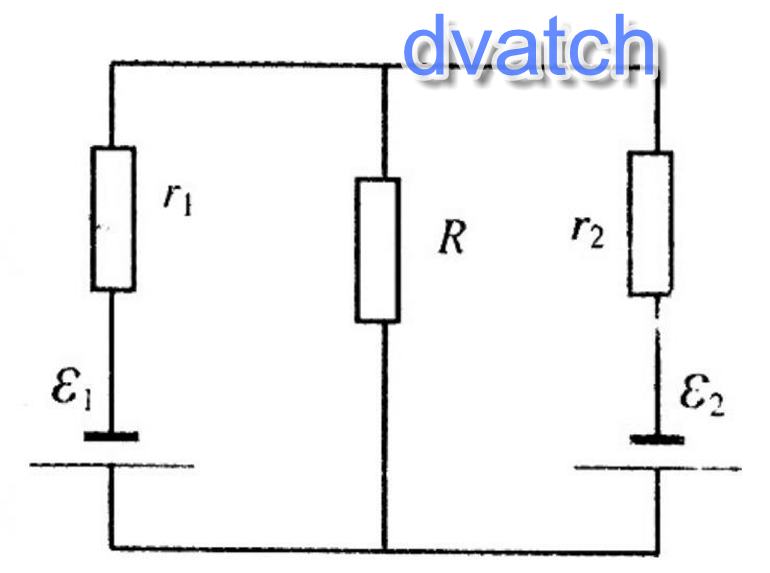 Пусть i1 - ток в ветви с R1, i2 - ток в ветви с R2, i -ток в ветви с R. Токи i1 и i2 направим вниз, ток i - вверх. Составим уравнения по 1 и 2 законам Кирхгофа.