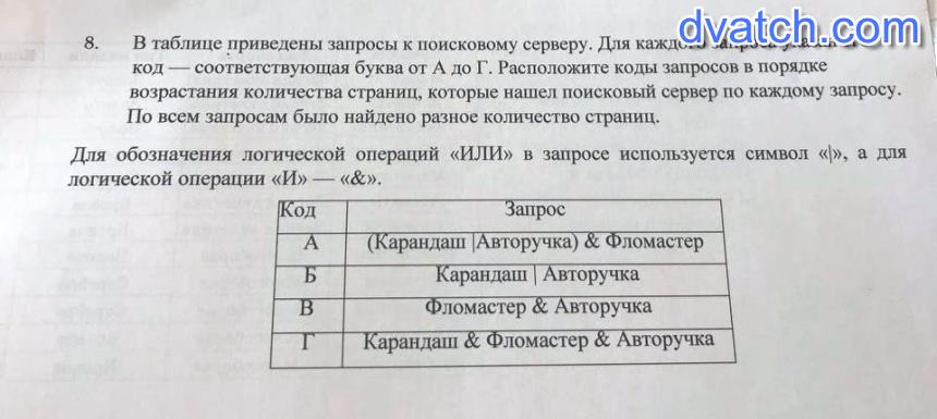 . В таблице приведены запросы к поисковому серверу. Для каждого запроса указан его - код соответствующая буква от А до Г. Расположите коды запросов в порядке возрастания количества страниц, которые нашел поисковый сервер по каждому запросу. По всем запросам было найдено разное количество страниц. Для обозначения логической операции "или" в запросе используется символ "|", а для логистической операции "И" - "&"