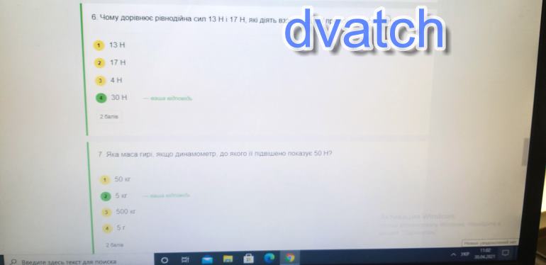 6. Якщо дві сили направлені в один напрямок, ми їх додаємо, тому: 13Н + 17Н = 30Н 7. P=mg m=P/g m=50/10=5кг Відповідь: 5 кг 11. Сила Архимеда: Fa=po(воды) gV V=Fa/pog=10/1000×10=0,001м3 Маса міді m=po(міді)/ )×V ро(меди)=8,9г/см3=8900кг/м3 m=8900×0,001=8,9кг Відповідь: 8,9 кг 12. 1 Знайдемо тиск на глибині 80 см Р= pо*g*h=1000*10*0,8=8000 Па 2 знайдемо площу пластини S= 0,02м*0,1м= 0,002 м кв. 3 знайдемо силу тиску на пластину F=P*S= 8000*0,002=16 Н Відповідь: 16 Н