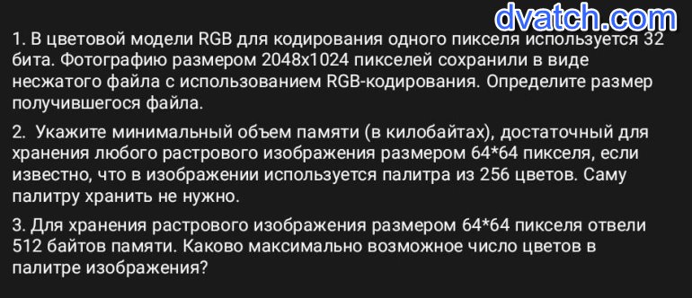 Задание ПО ИНФОРМАТИКЕ 1) В цветовой модели RGB для кодирования одного пикселя используется 32 бита. Фотографию с размером 2048×1024 пикселей сохранили в виде несжатого файла с использованием RGB кодирования. Определите размер получившегося файла Всего 3 задачи(ещё 2 в файле) Заранее спасибо ❤️