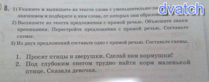 8. 1) Укажите и выпишите из текста слова с уменьшительно-ласкательным значением и подберите к ним слова, от которых они образованы. 2) Выпишите из текста предложения спрямой речью. Объясните знаки препинания. Перестройте предложения с прямой речью. Составьте схемы. 3) Из двух предложений составьте одно спрямой речью. Составьте схемы. 1. Просят птицы и зверушки. Сделай нам кормушки 2. Под глубоким снегом трудно найти корм маленькой птице. Сказала девочка. Пжжж посчитайте Ответ нужен до завтра ㅜㅜ посчитайте ㅜㅜ