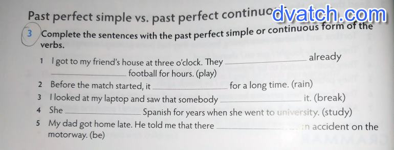 1. I got to my friend's house at three o'clock. They had been already playing football for hours.