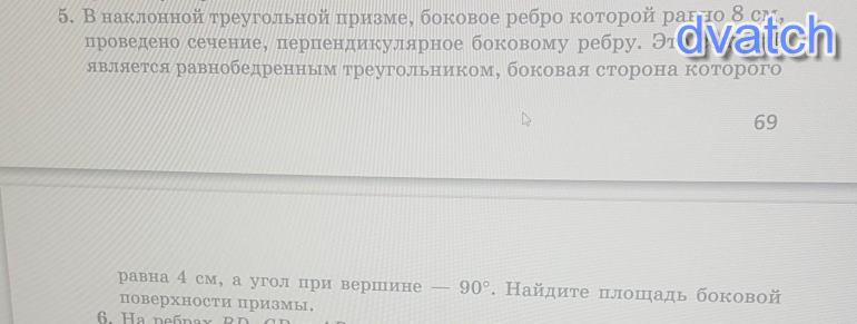 Объяснение:дано в наклонной призме боковое ребро равно 8 проведено сечение ⊥ к боковым ребрам . В сечении образуется равнобедренный треугольник боковая сторона которого 4 ; а угол при вершине 90 . так же можно понять что стороны сечения будут высотами граней то есть боковое стороны будут параллелограммами вычислим площадь боковой поверхности решение на фото