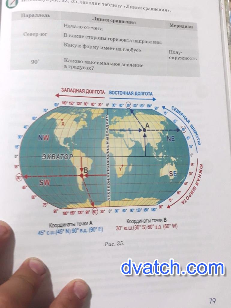 ДАЮ 100 БАЛ посчитайте ПРОШУ ВАСПЕРВОЕ ЗАДАНИЕ:Алгоритм определения географических координат 1. Найди географическую широту точки. Сначала определи, в каком полушарии (в Северном или Юж- ном) находится заданная точка. Если выше экватора, то в верном, если ниже, то в Южном. 1) Определи, между какими параллелями (обычно они под писываются справа или слева от края карты) находится точка: 2) Выясни, Как узнать сколько градусов от ближайшей со стороны эква тора параллели до заданной точки. 3) В качестве примера определения географических коорди- нат используй рис. 35. ВТОРОЕ ЗАДАНИЕ:. Определи географическую долготу точки. 1) В каком полушарии (в западном или восточном) относи- тельно Гринвича она находится. Если слева от Гринвича, то в западном, если справа, то в восточном. 2. Определи, между какими меридианами находится точ- ка (их долгота обычно подписывается на верхнем и на нижнем краях карты, а иногда в месте пересечения с экватором). 3) Выясни, Как узнать сколько градусов до точки от ближайшего со стороны Гринвича меридиана.