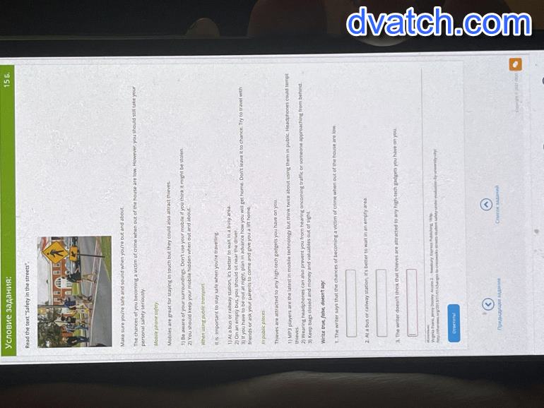 Read the text "Safety in the streets". Make sure you’re safe and sound when you’re out and about. The chances of you becoming a victim of crime when out of the house are low. However, you should still take your personal safety seriously. Mobile phone safety. Mobiles are great for staying in touch but they could also attract thieves. 1) Be aware of your surroundings. Don’t use your mobile if you think it might be stolen. 2) You should keep your mobile hidden when out and about. When using public transport. It is important to stay safe when you’re travelling. 1) At a bus or railway station, it’s better to wait in a busy area. 2) On an empty bus, you should sit near the driver. 3) If you have to be out at night, plan in advance how you will get home. Don’t leave it to chance. Try to travel with friends or ask your parents to come and give you a lift home. In public places. Thieves are attracted to any high-tech gadgets you have on you. 1) MP3 players are the latest in mobile technology but think twice about using them in public. Headphones could tempt thieves. 2) Wearing headphones can also prevent you from hearing oncoming traffic or someone approaching from behind. 3) Keep bags closed and money and valuables out of sight. Write true, false, doesn’t say:1. The writer says that the chances of becoming a victim of crime when out of the house are low. 2. At a bus or railway station, it’s better to wait in an empty area. 3. The writer doesn’t think that thieves are attracted to any high-tech gadgets you have on you.