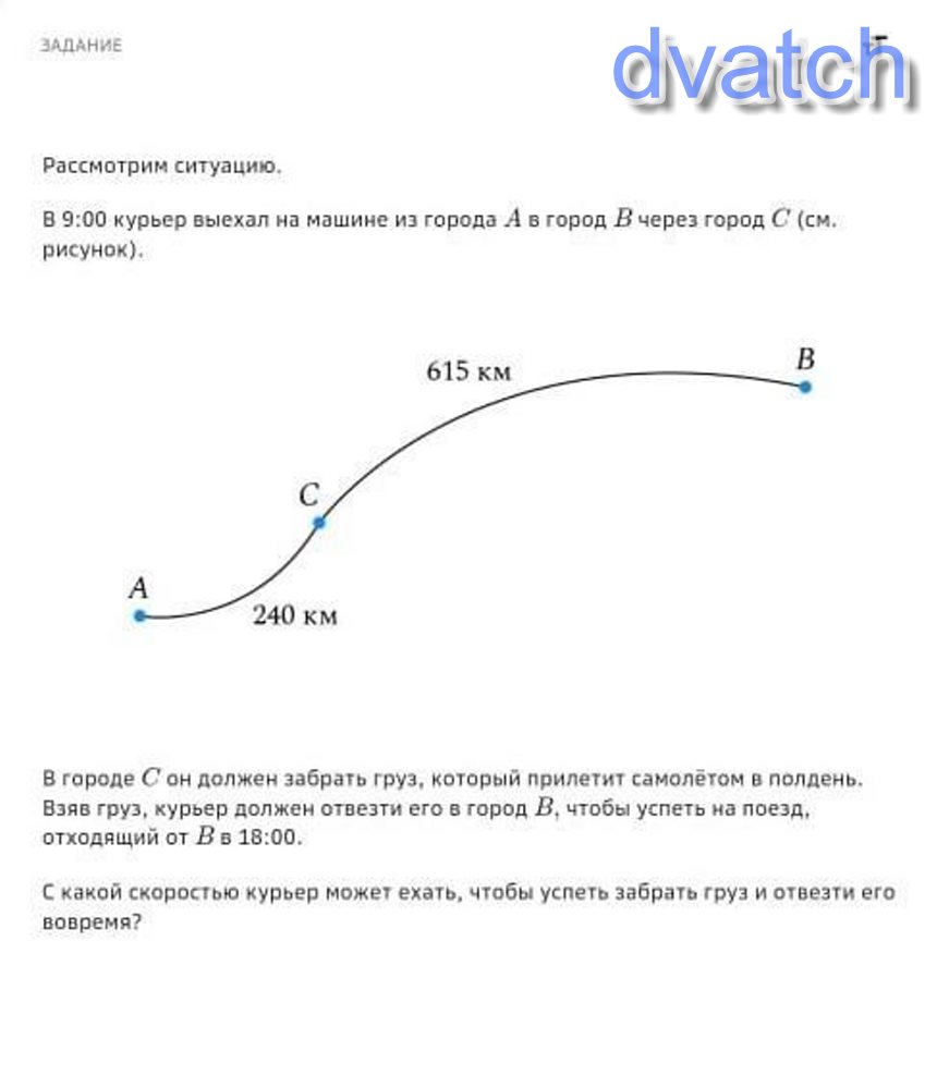 Между А и С 240 км, с 9:00 до 12:00 у него есть 3 часа. 240/3 = 80км/ч может ехать до города С. Между С и В 615 км, время с 12:00 до 18:00 это 6 часов. 615/6 = 102,5 км/ч.