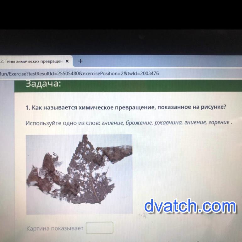1. Как называется химическое превращение, показанное на рисунке?Используйте одно из слов: гниение, брожение, ржавчина, гниение, горение.