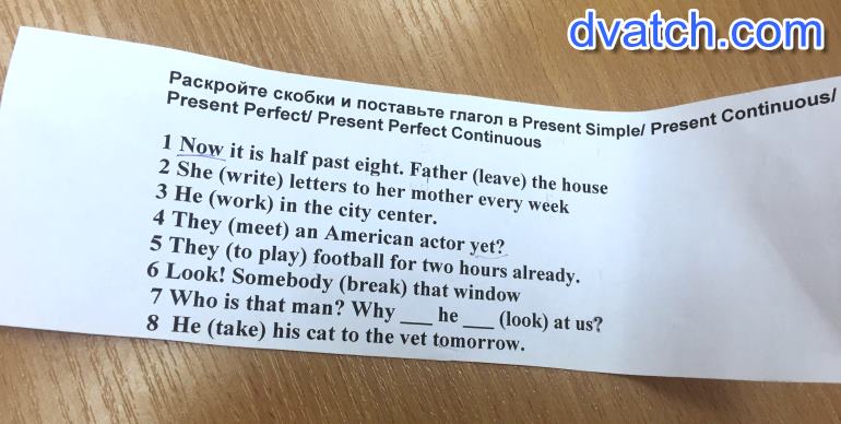 Раскройте скобки и поставьте глагол в Present Simple/Present Continuous/Present Perfect/ Present Perfect Continuous. 1. Now it is half past eight. Father (leave) the house. 2. She (write) letters to her mother every week. 3. He (work) in the city center. 4. They (meet) an American actor yet? 5. They (to play) football for two hours already. 6. Look Somebody (break) that window. 7. Who is that man? Why__he__(look) at us? 8. He (take) his cat to the vet tomorrow.