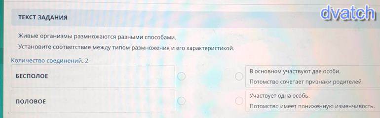 ОЧЕНЬ посчитайте ЗАДАНИЕ N°4ТЕКСТ ЗАДАНИЯ Живые организмы размножаются разными способами. Установите соответствие между типом размножения и его характеристикой. Количество соединений: 2БЕСПОЛОЕВ основном участвуют две особи. Потомство сочетает признаки родителейУчаствует одна особь. ПОЛОВОЕПотомство имеет пониженную изменчивость.